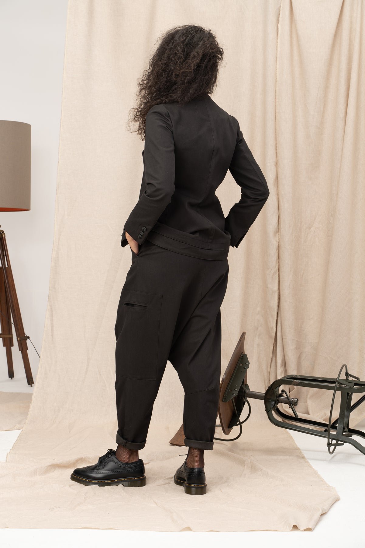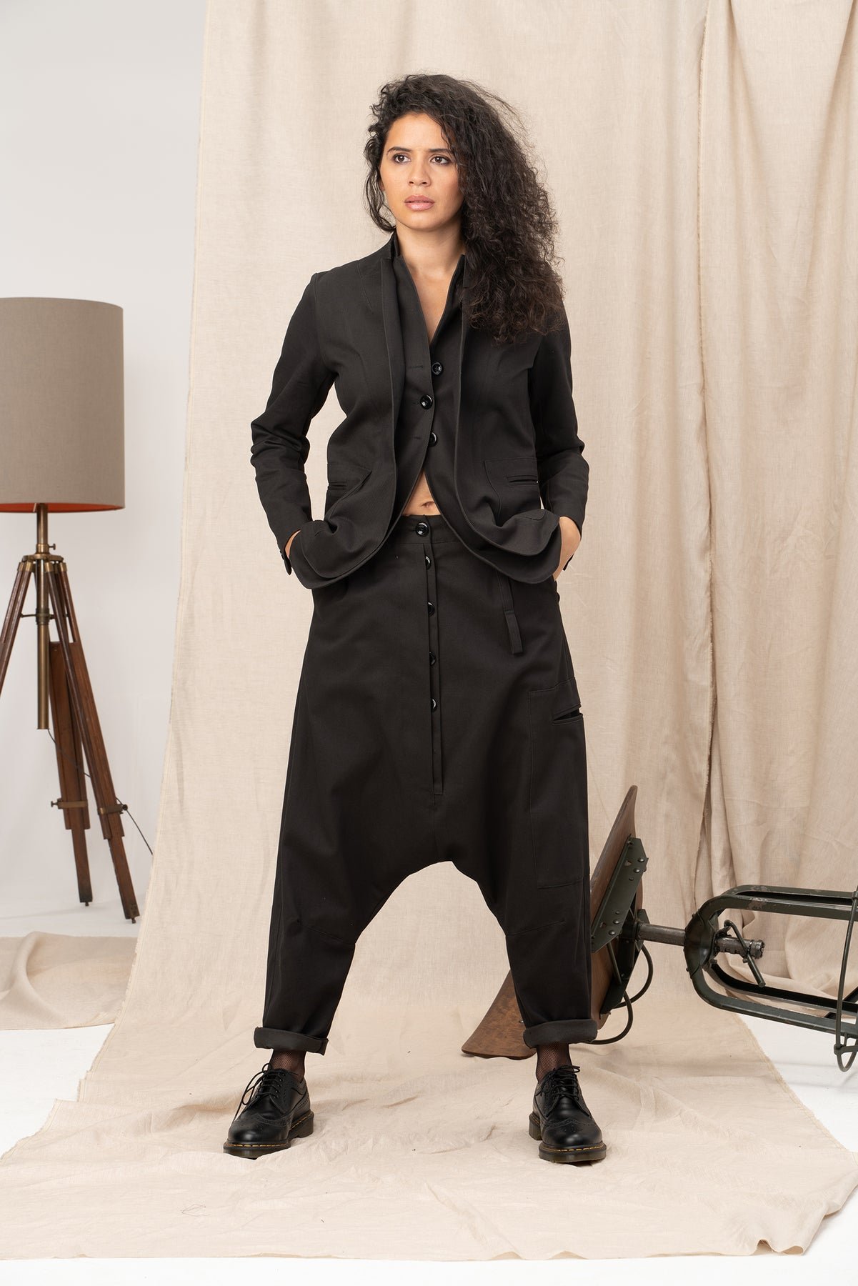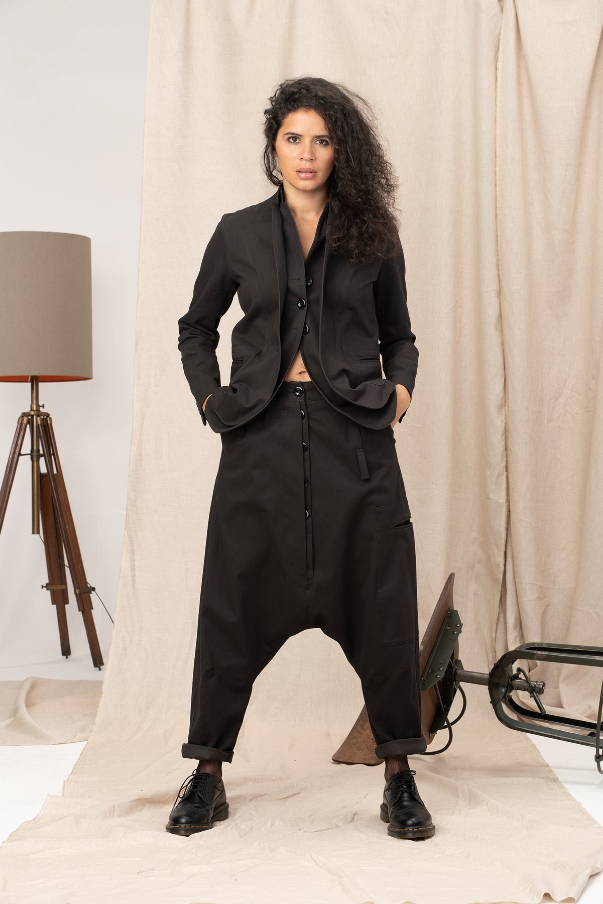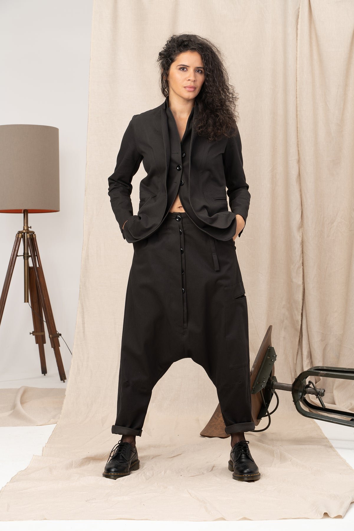 Inspire them all in the Avant garde Denim Harem Pants with Asymmetrical Details. This avant garde clothing - black denim baggy pants women feature a mid waisted construction, with front button closure, two front pockets and two non-standard back pockets, as well as one side pocket. Perfect for work and daily life. This avant garde clothing is designed to flatter every body type and fit numerous occasions. These cotton pants feature an avant garde cut, wide crotch and an elastic at the back of the waist. High rise with a black baggy pants women, you'll be at your highest comfort level without compromising style.