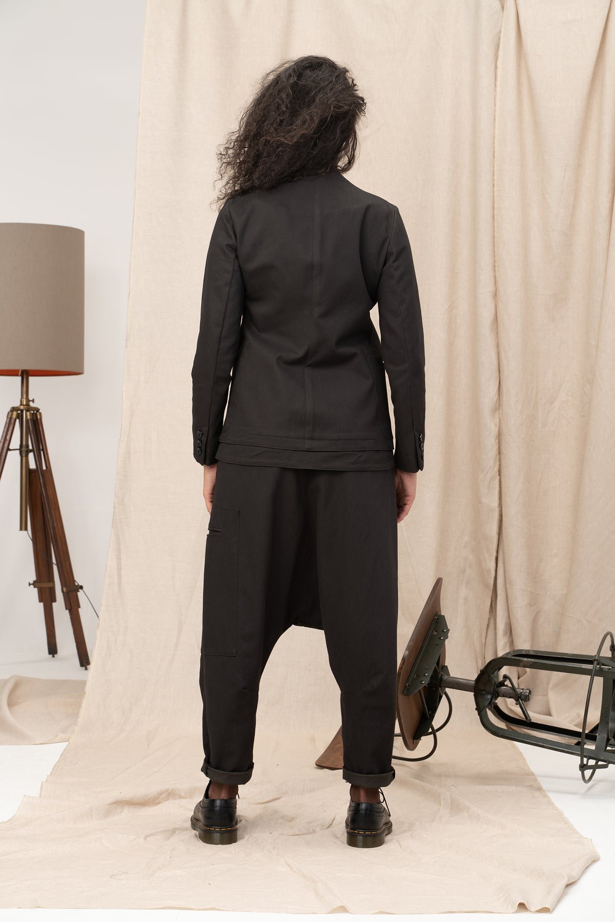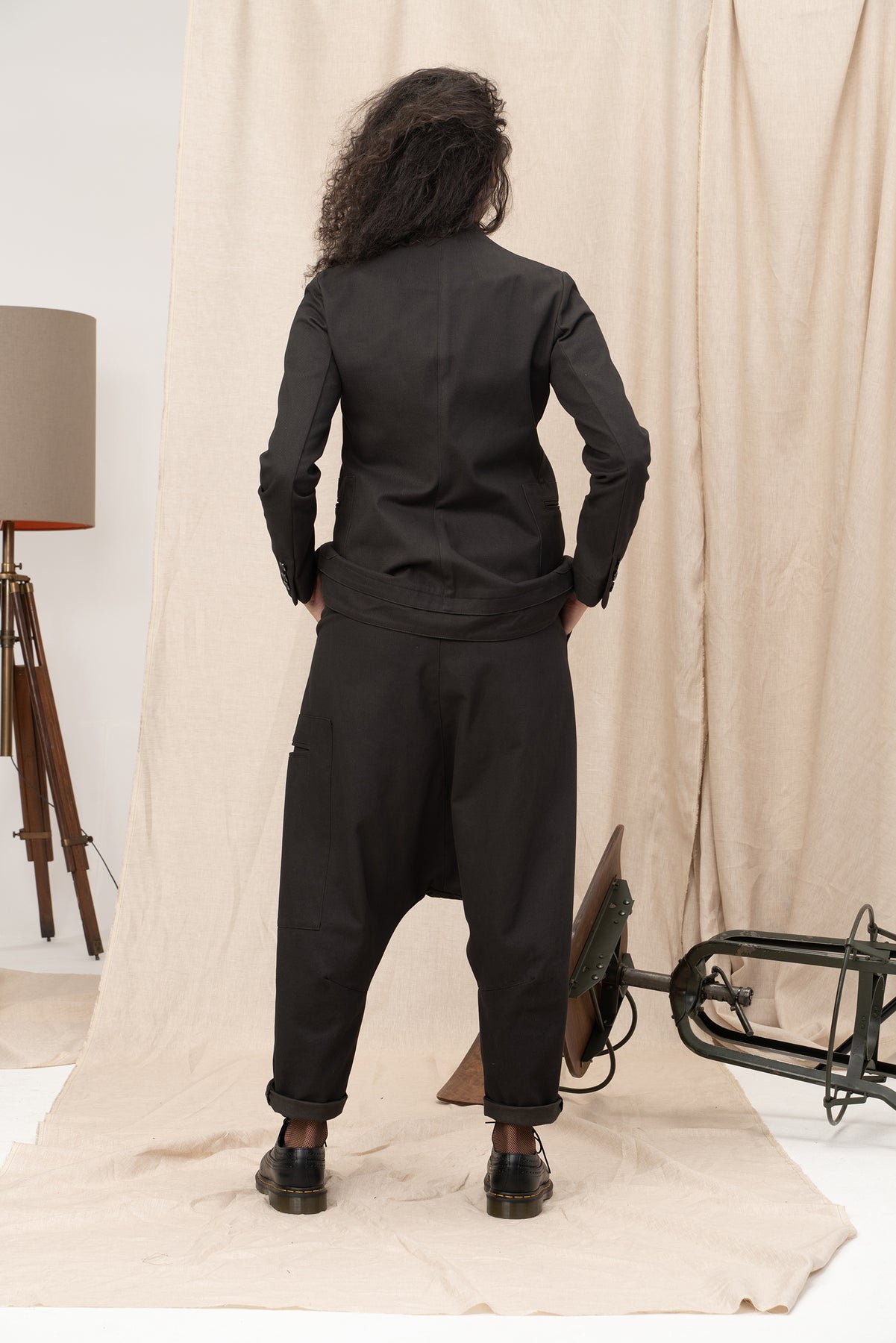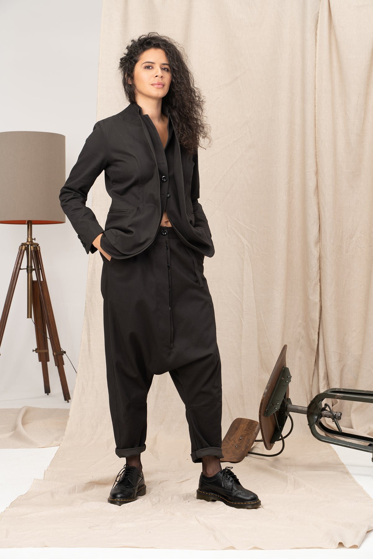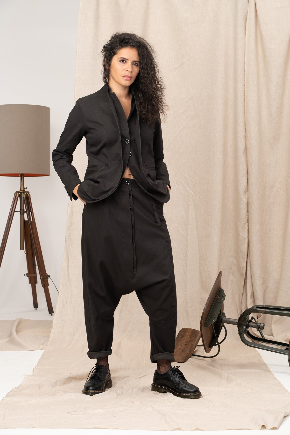Inspire them all in the Avant garde Denim Harem Pants with Asymmetrical Details. This avant garde clothing - black denim baggy pants women feature a mid waisted construction, with front button closure, two front pockets and two non-standard back pockets, as well as one side pocket. Perfect for work and daily life. This avant garde clothing is designed to flatter every body type and fit numerous occasions. These cotton pants feature an avant garde cut, wide crotch and an elastic at the back of the waist. High rise with a black baggy pants women, you'll be at your highest comfort level without compromising style.