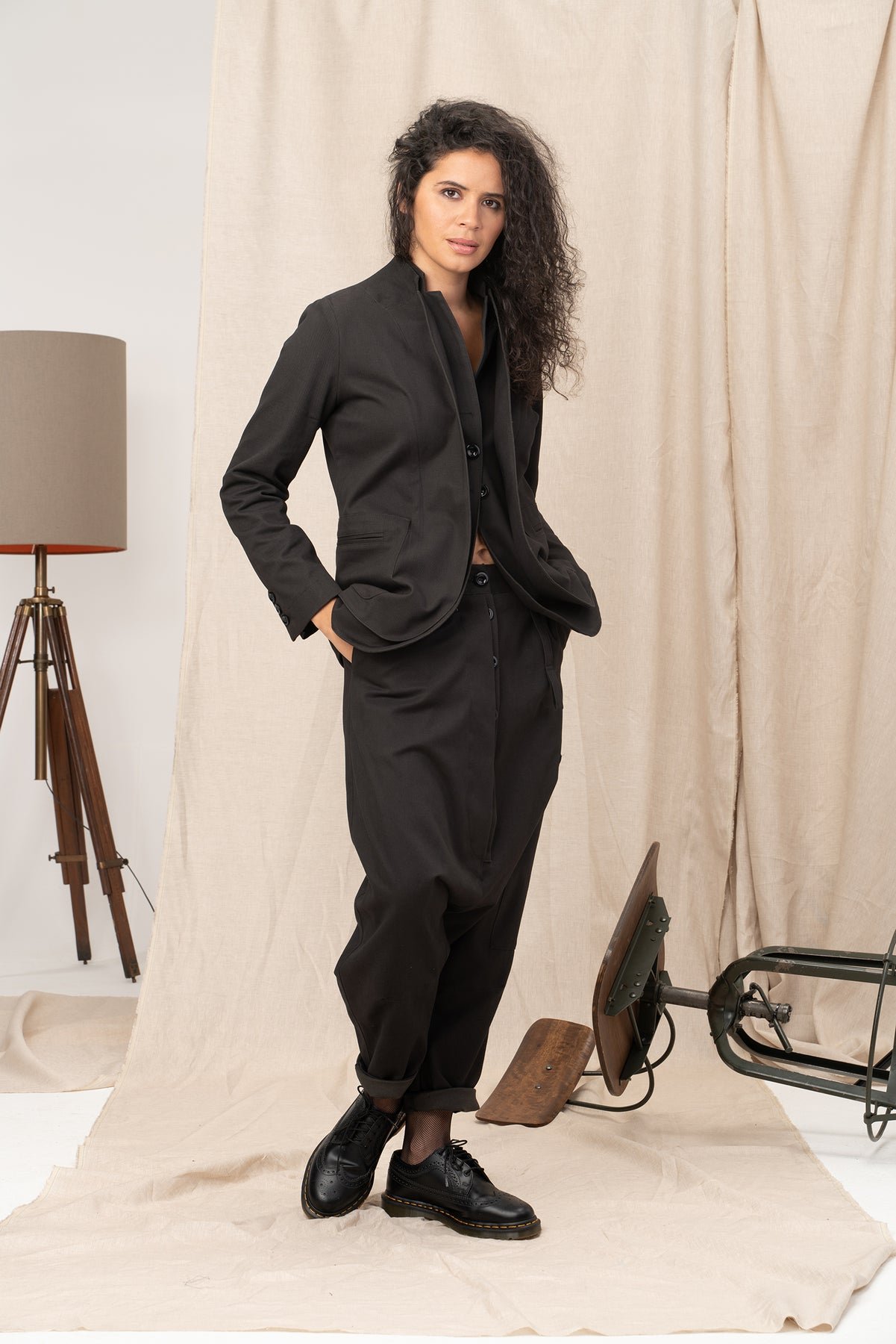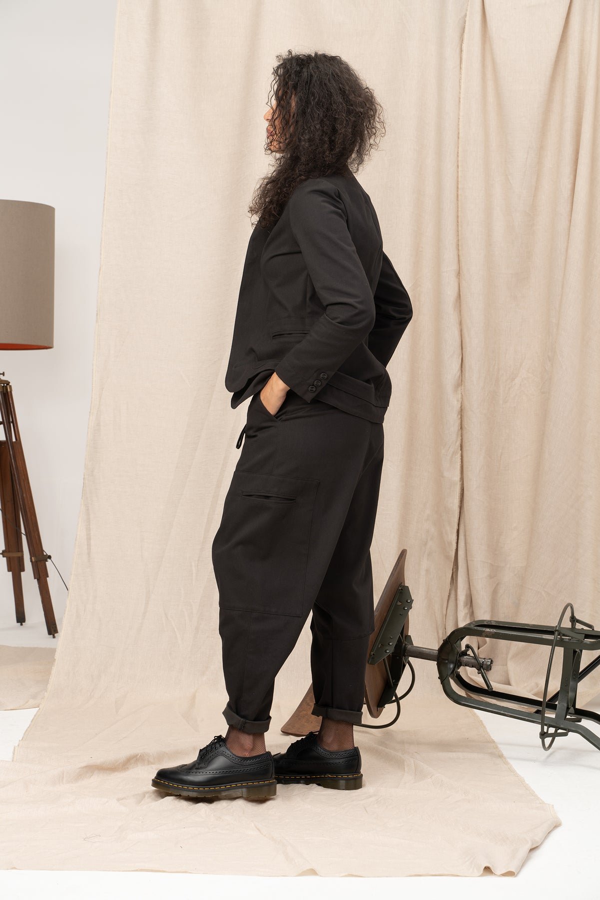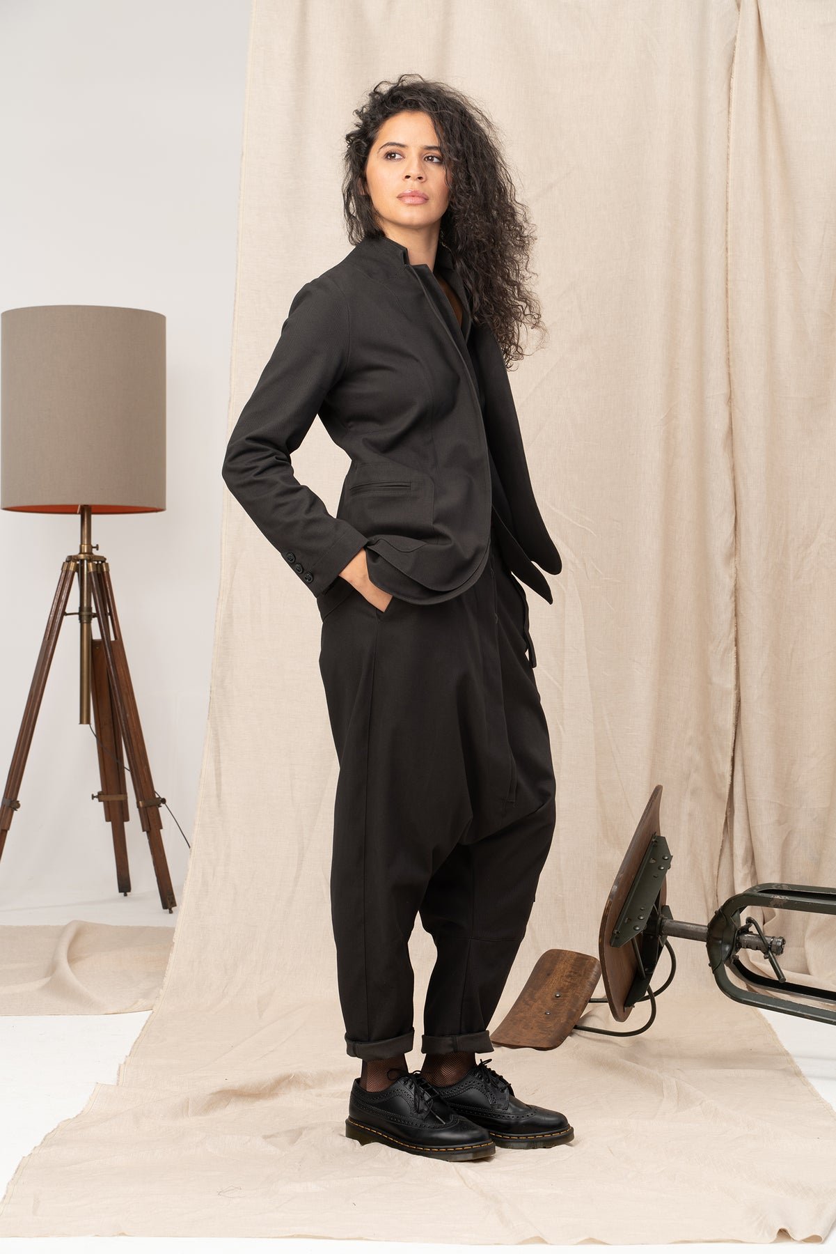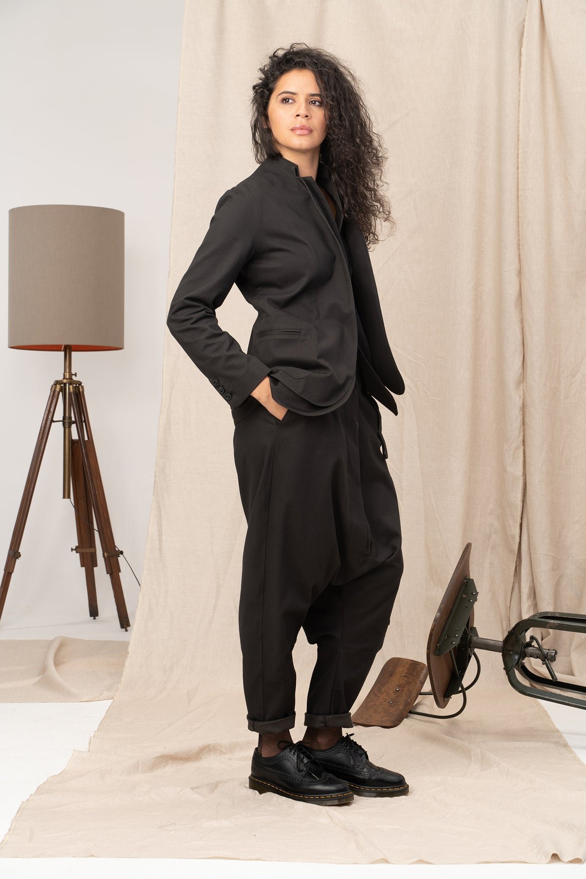 Inspire them all in the Avant garde Denim Harem Pants with Asymmetrical Details. This avant garde clothing - black denim baggy pants women feature a mid waisted construction, with front button closure, two front pockets and two non-standard back pockets, as well as one side pocket. Perfect for work and daily life. This avant garde clothing is designed to flatter every body type and fit numerous occasions. These cotton pants feature an avant garde cut, wide crotch and an elastic at the back of the waist. High rise with a black baggy pants women, you'll be at your highest comfort level without compromising style.