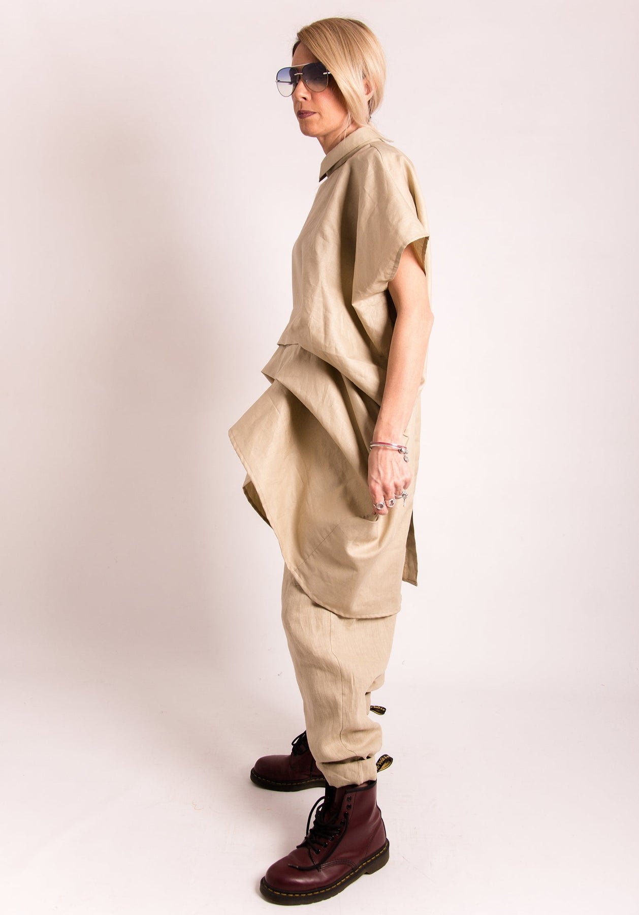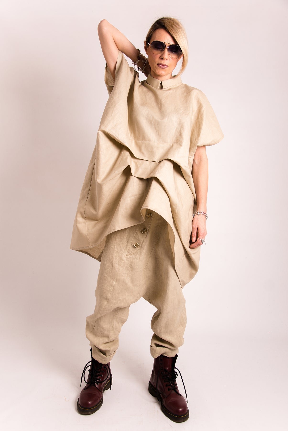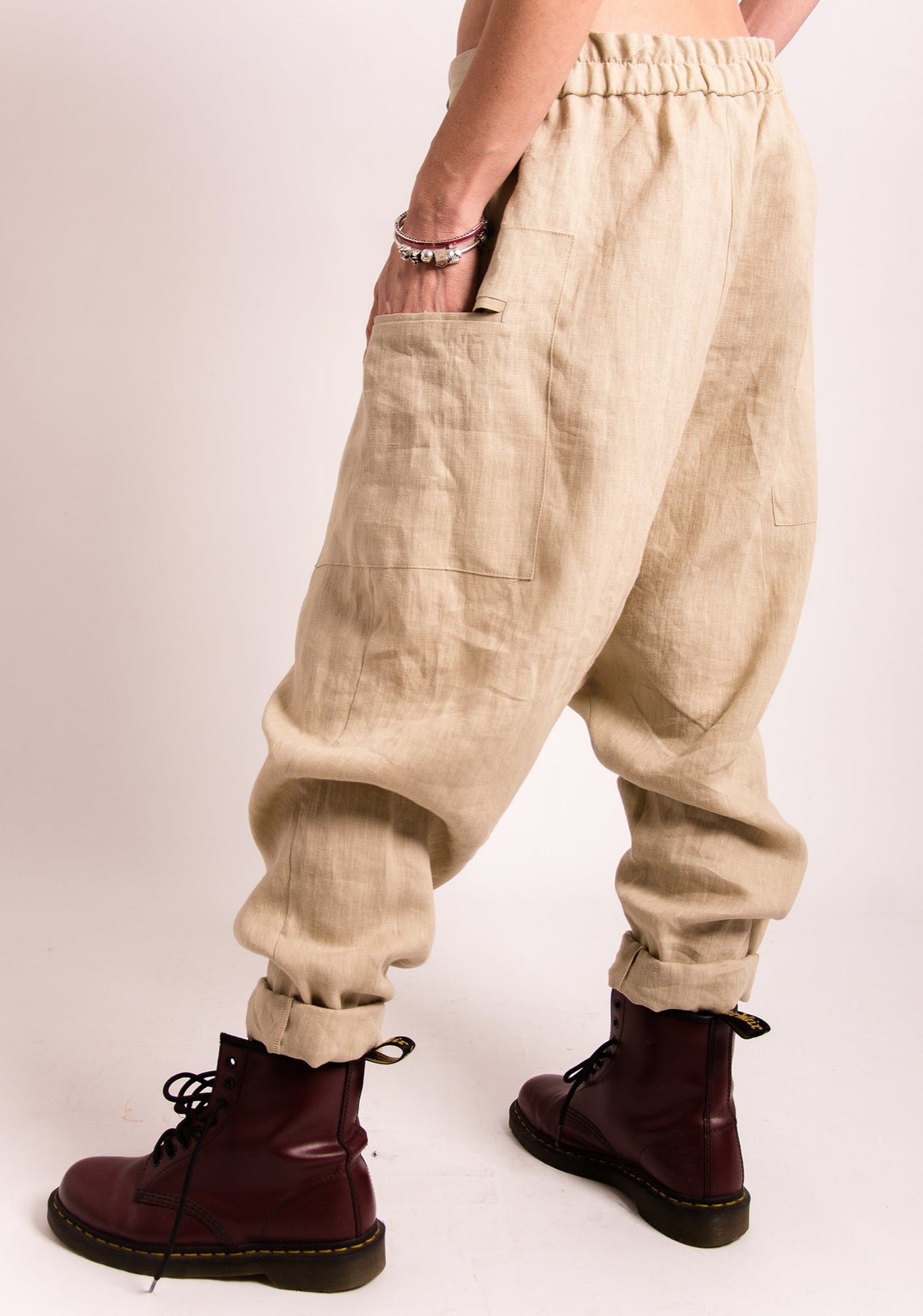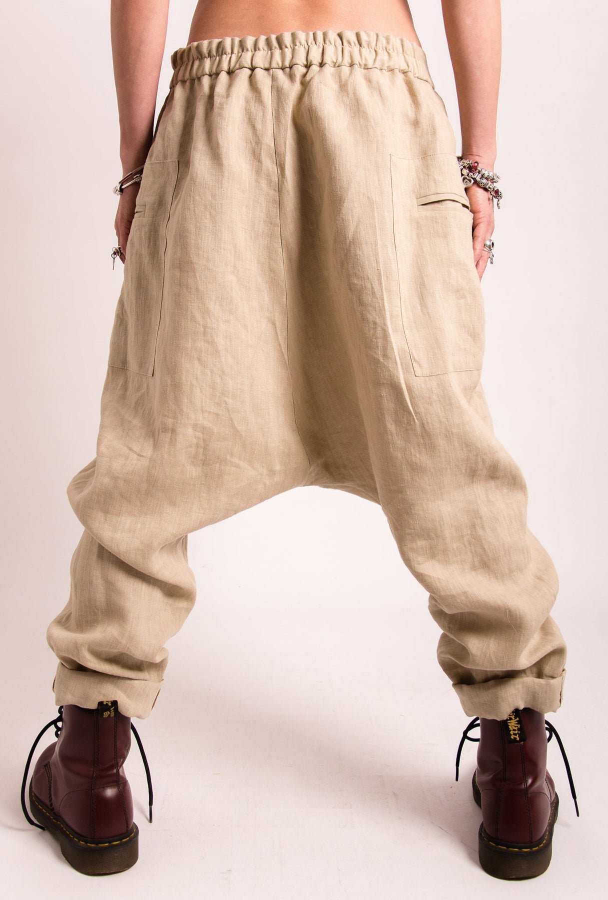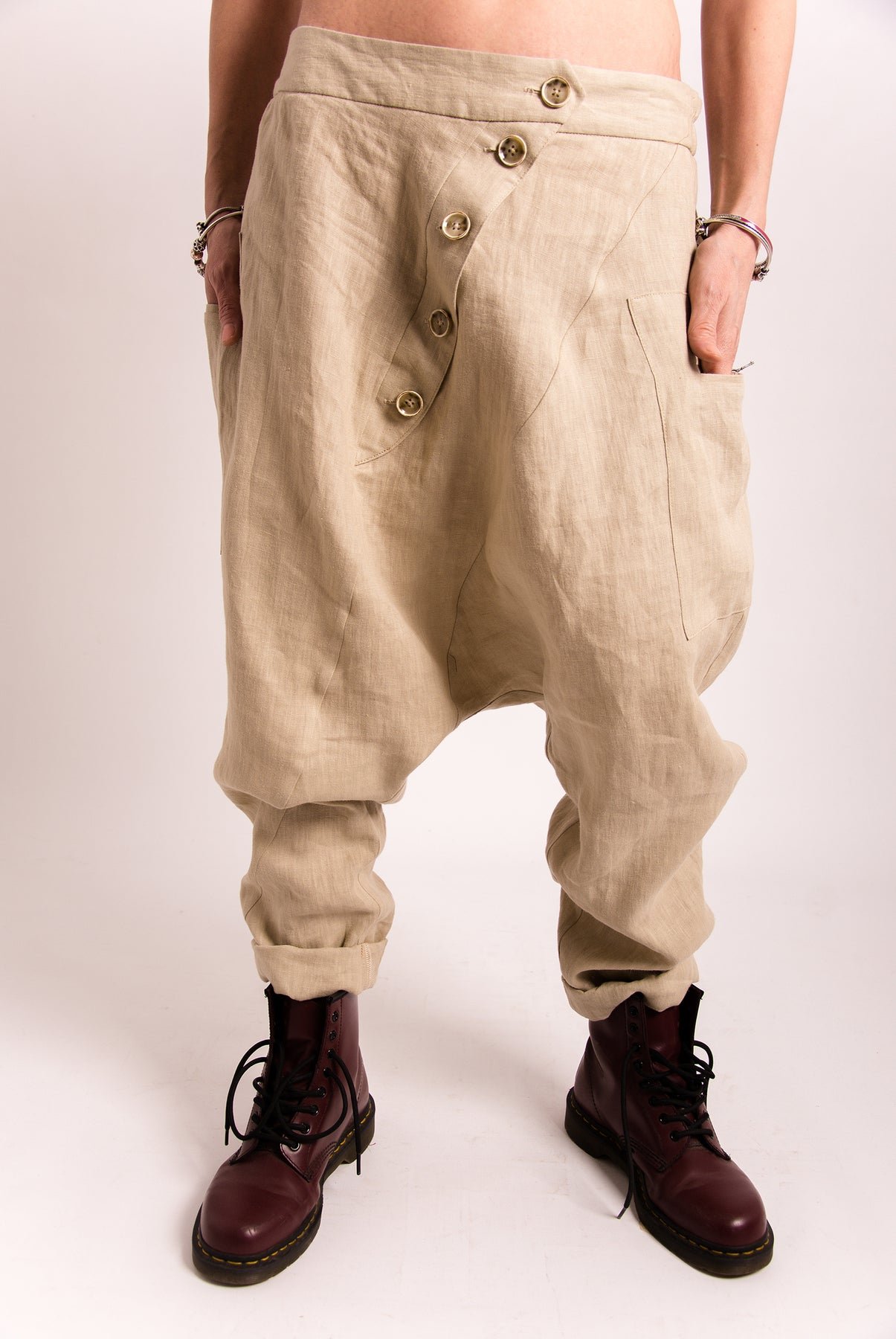 Update your streetwear with the Beige Organic Linen Harem Pants women. These loose fitting pants women feature a low waisted construction, front asymmetric button closure. The pants have two side pockets for convenient storage.