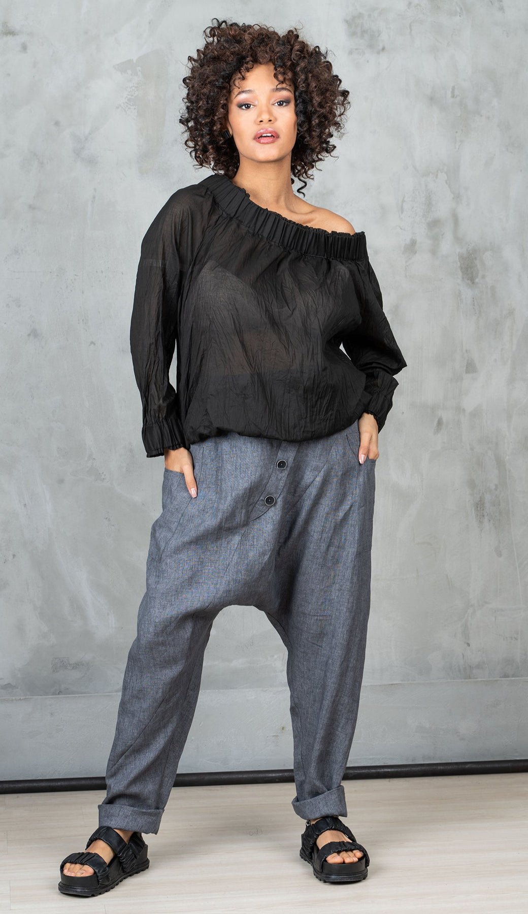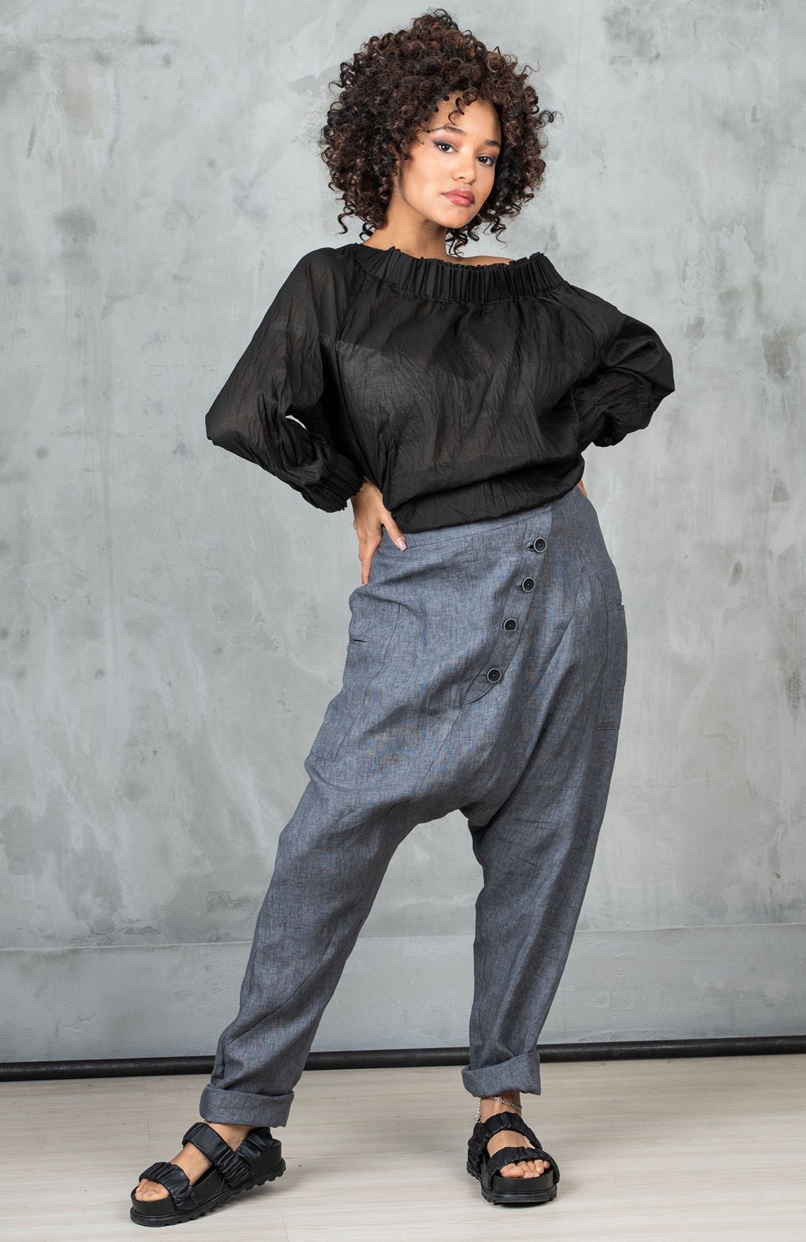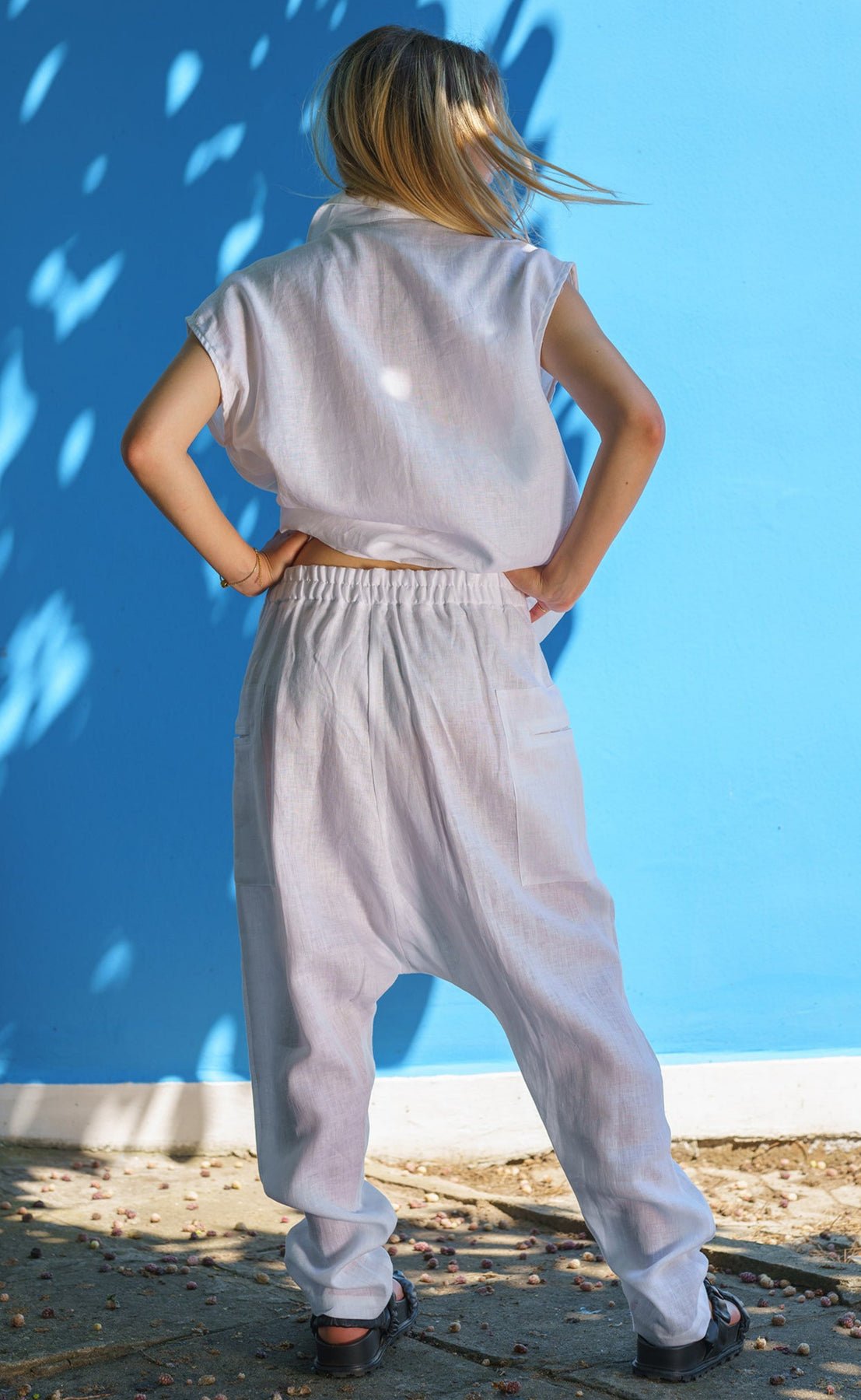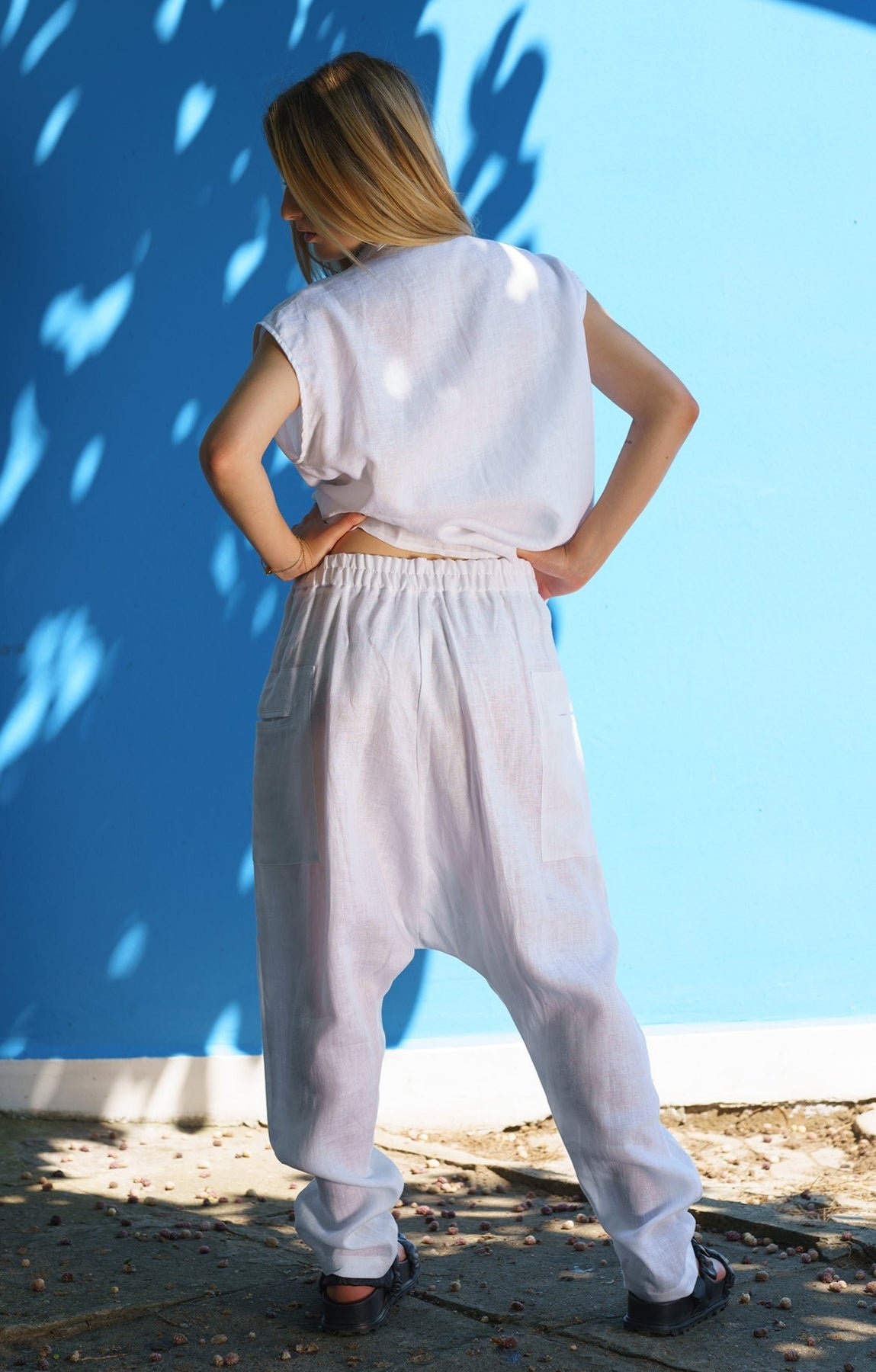 This linen clothing is designed to flatter every body type and fit numerous occasions. When we designed these drop crotch pants we focused on the versatility of each model to make it a perfect match for your favorite accessories and wardrobe pieces.