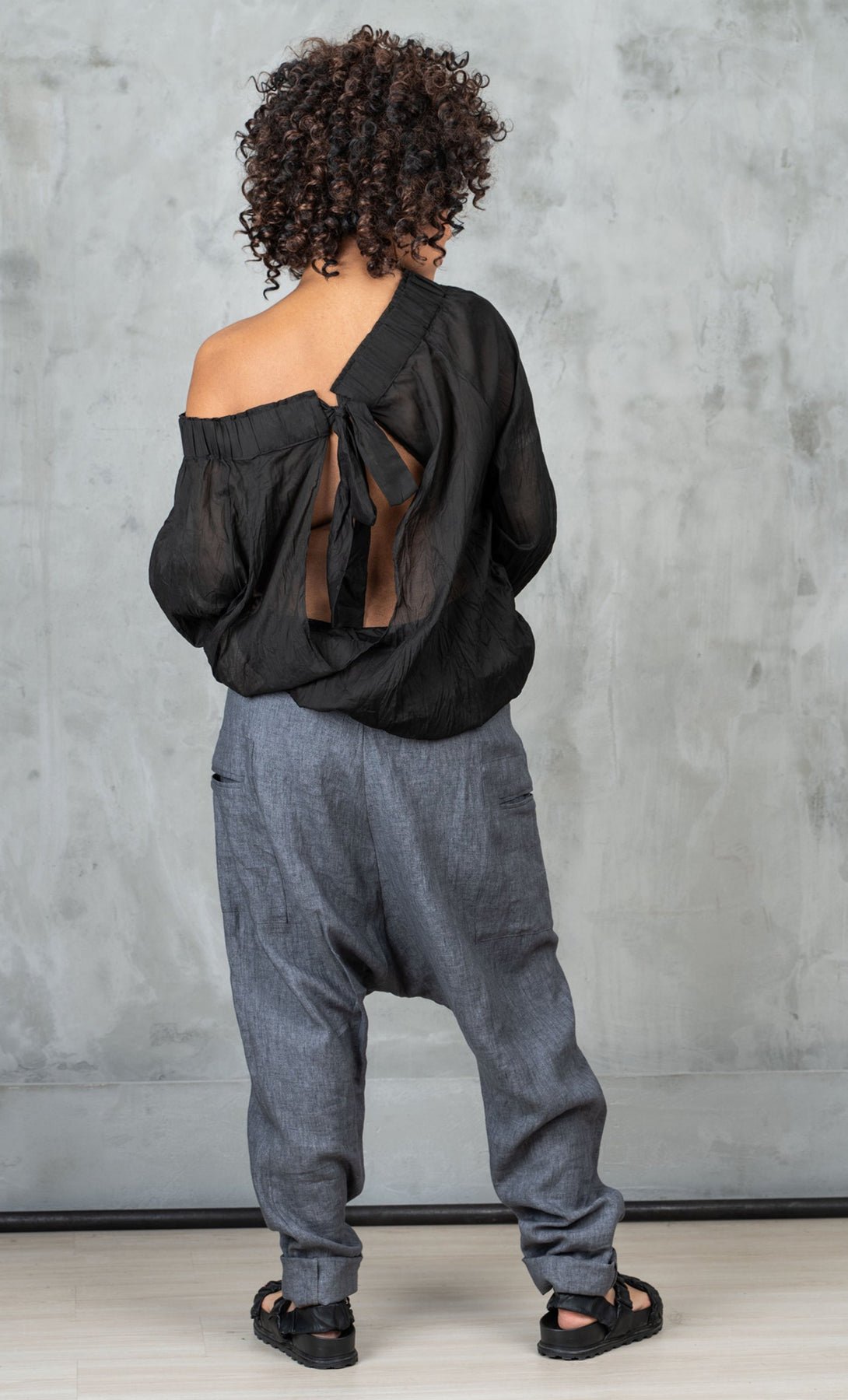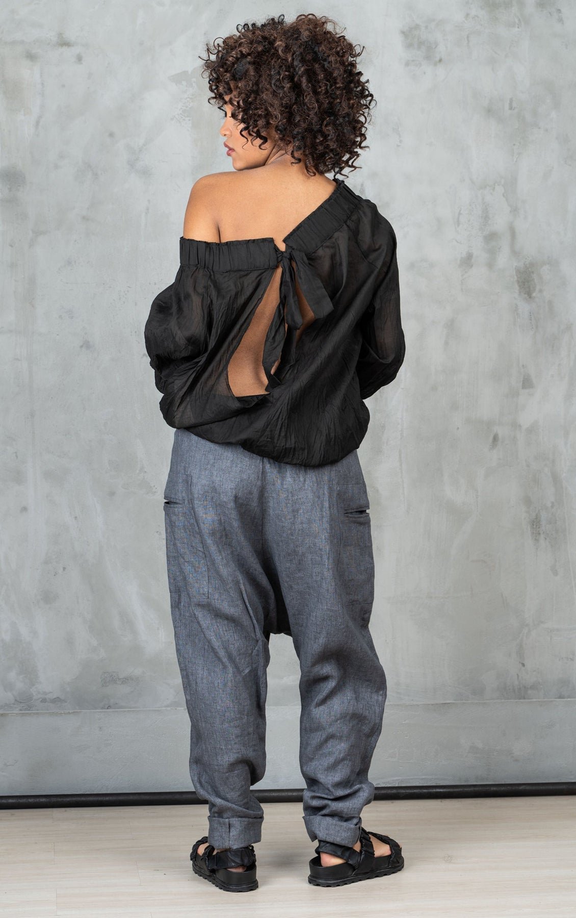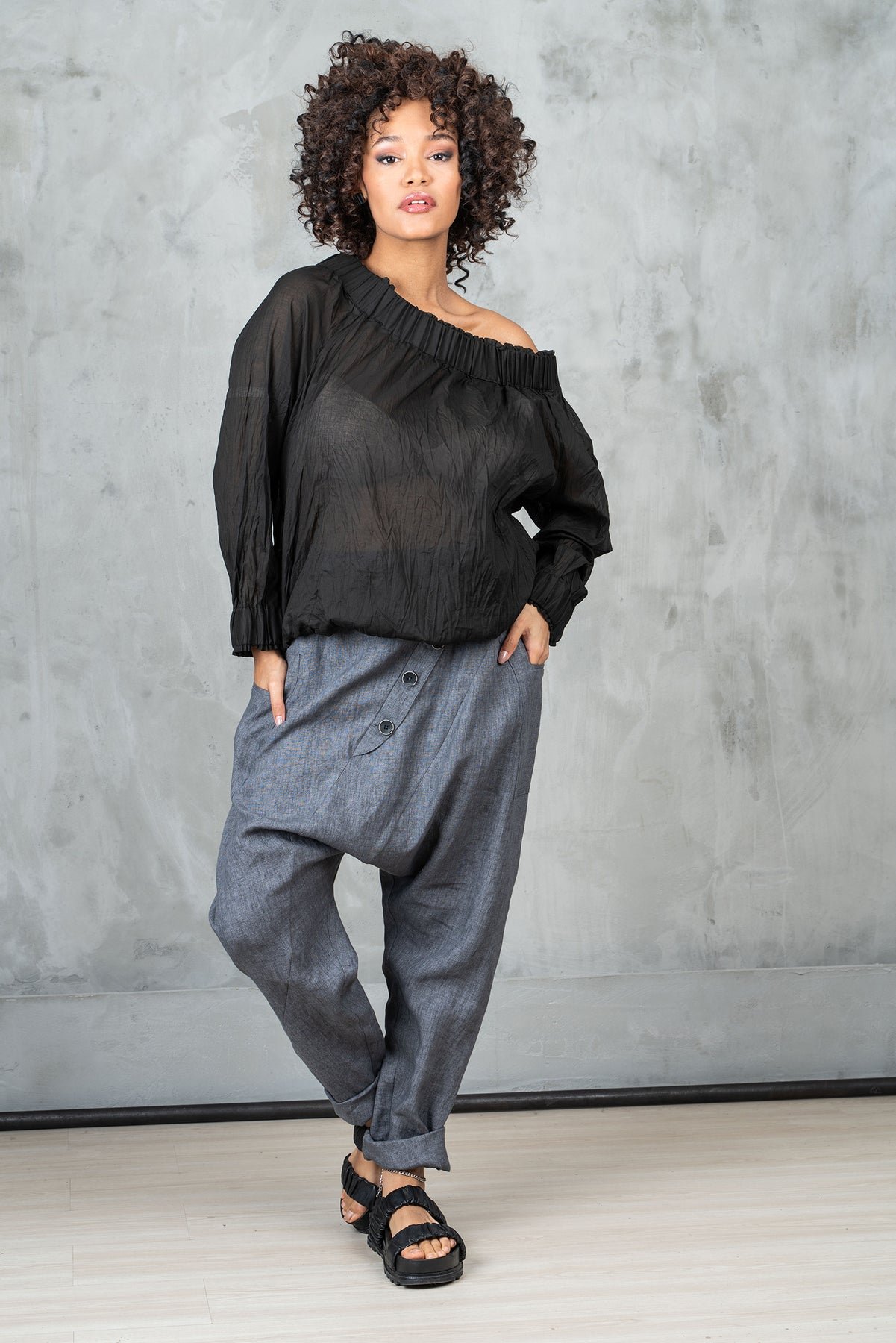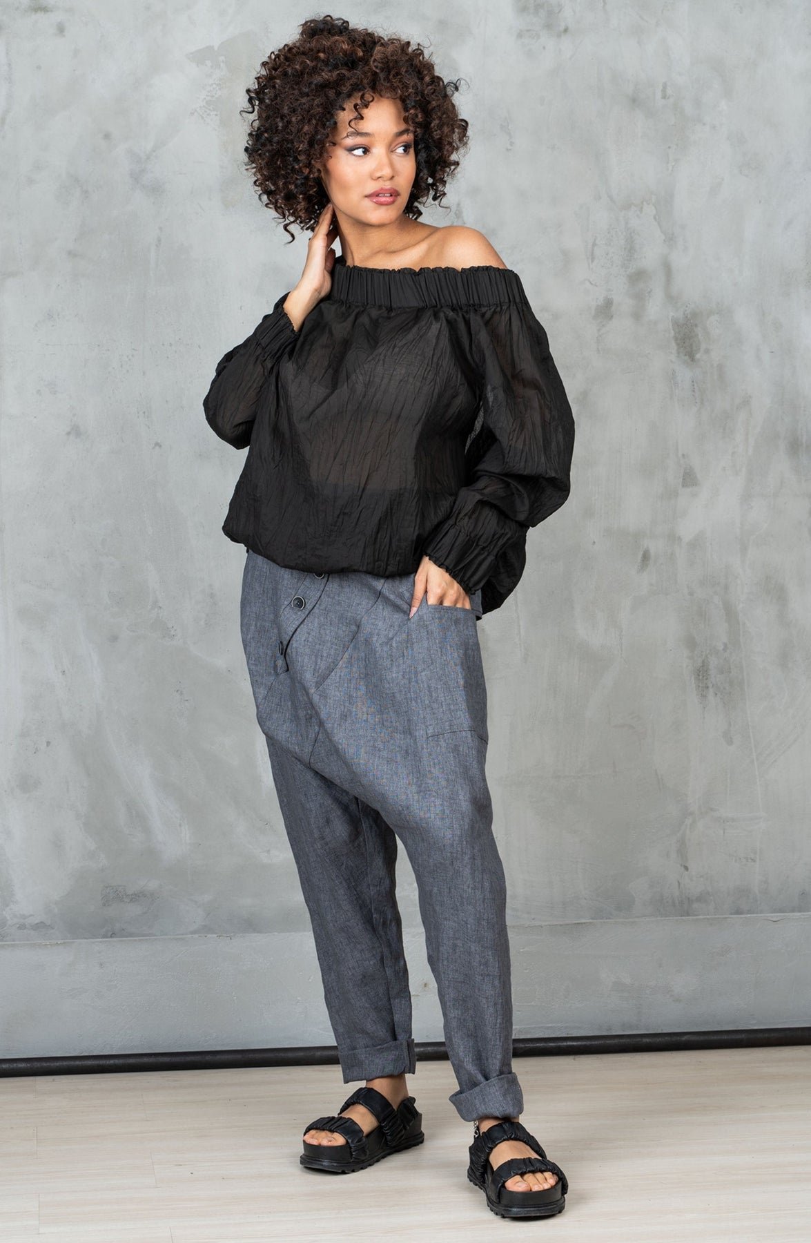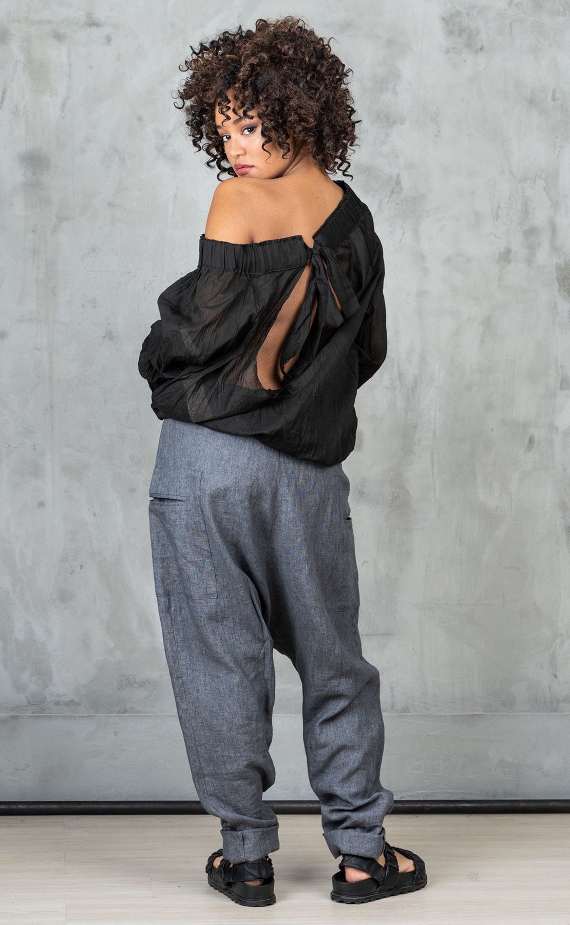 This linen clothing is designed to flatter every body type and fit numerous occasions. When we designed these drop crotch pants we focused on the versatility of each model to make it a perfect match for your favorite accessories and wardrobe pieces.