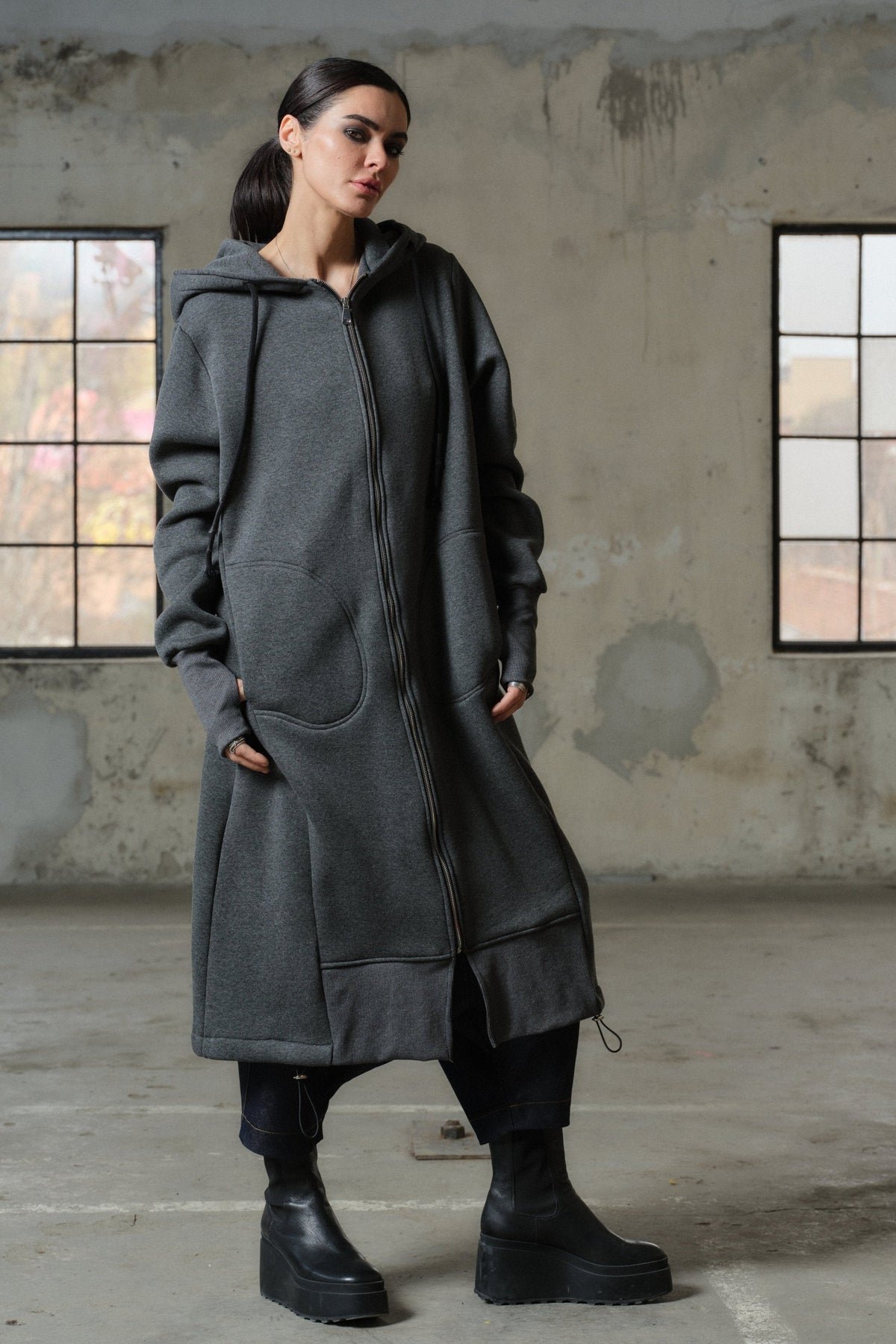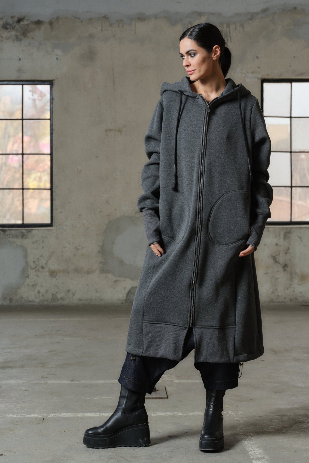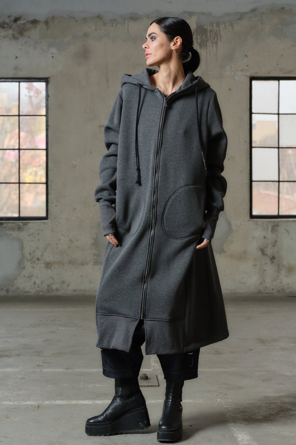 This long cotton hoodie blends contemporary style with practical features. Unique decorative stitches add a distinct touch, while a drawstring at the hem allows for a customizable fit. The hood, also equipped with a drawstring, offers adjustable coverage. With two side pockets for convenience and cuffs designed with thumb holes for extra comfort, this hoodie combines functionality with modern design. The front zip closure enhances its sleek appearance and makes layering a breeze.