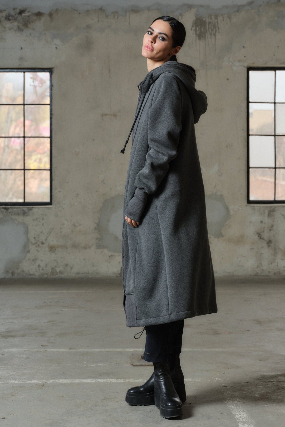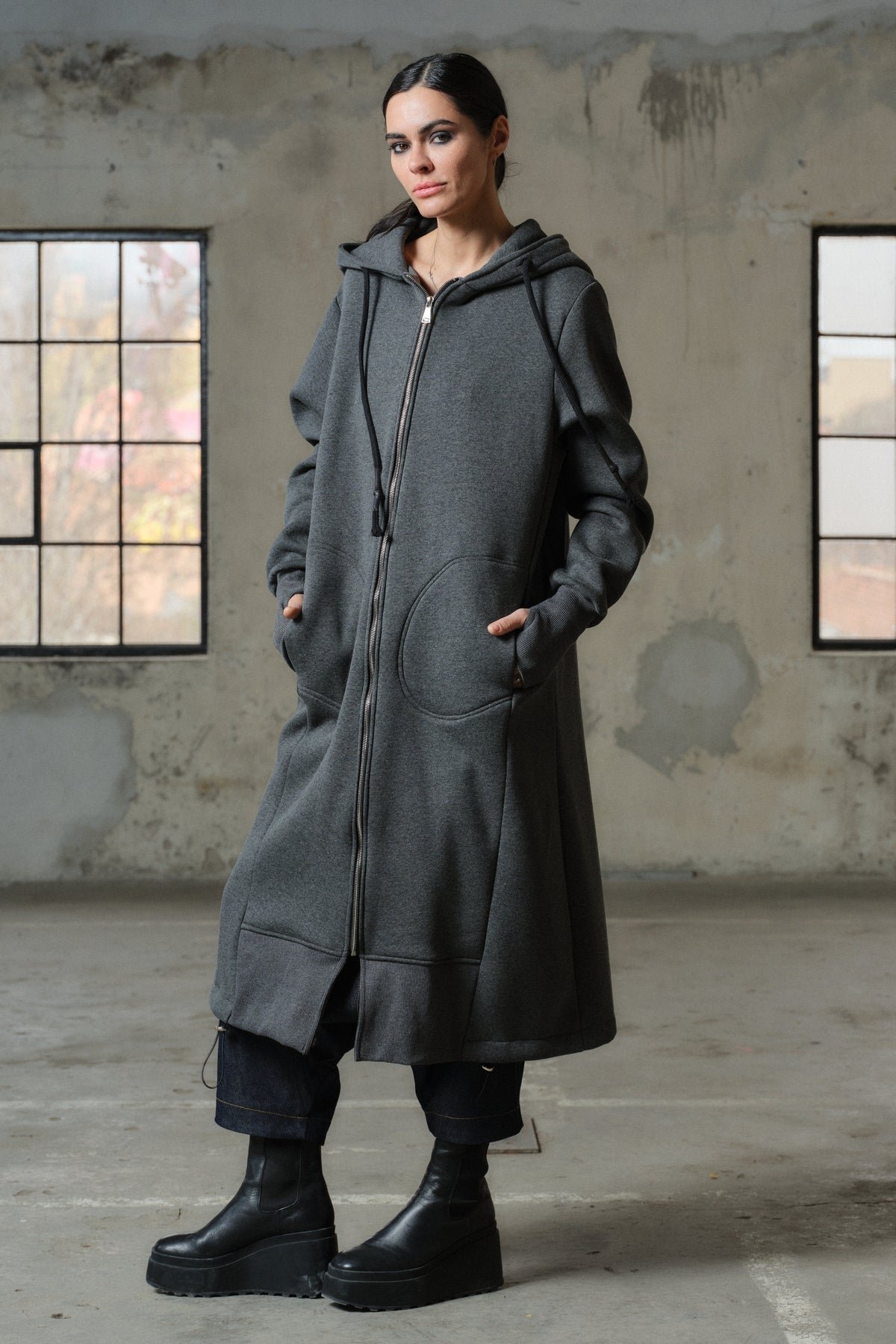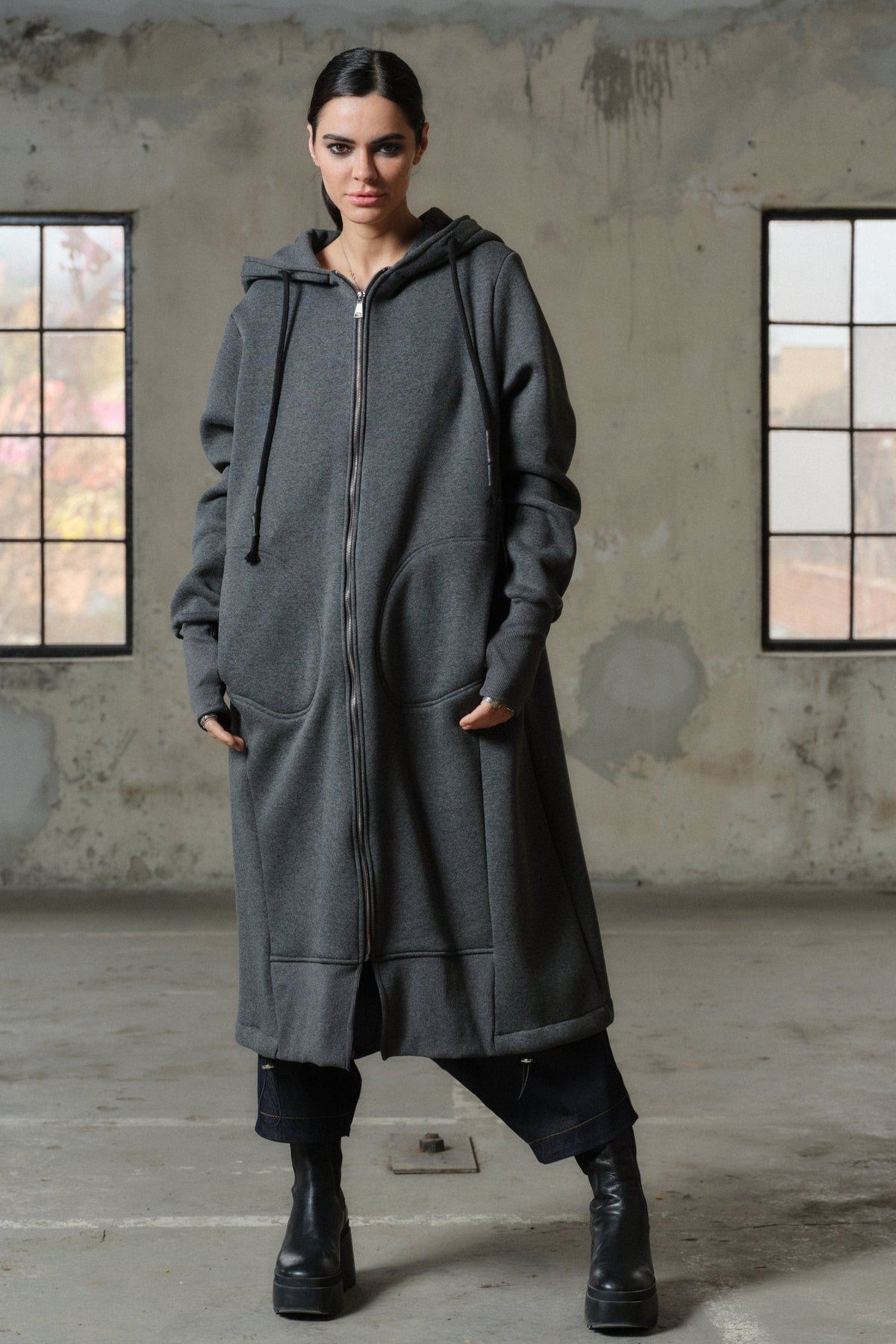 This long cotton hoodie blends contemporary style with practical features. Unique decorative stitches add a distinct touch, while a drawstring at the hem allows for a customizable fit. The hood, also equipped with a drawstring, offers adjustable coverage. With two side pockets for convenience and cuffs designed with thumb holes for extra comfort, this hoodie combines functionality with modern design. The front zip closure enhances its sleek appearance and makes layering a breeze.