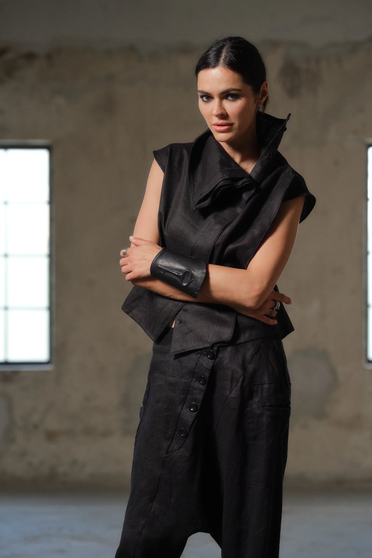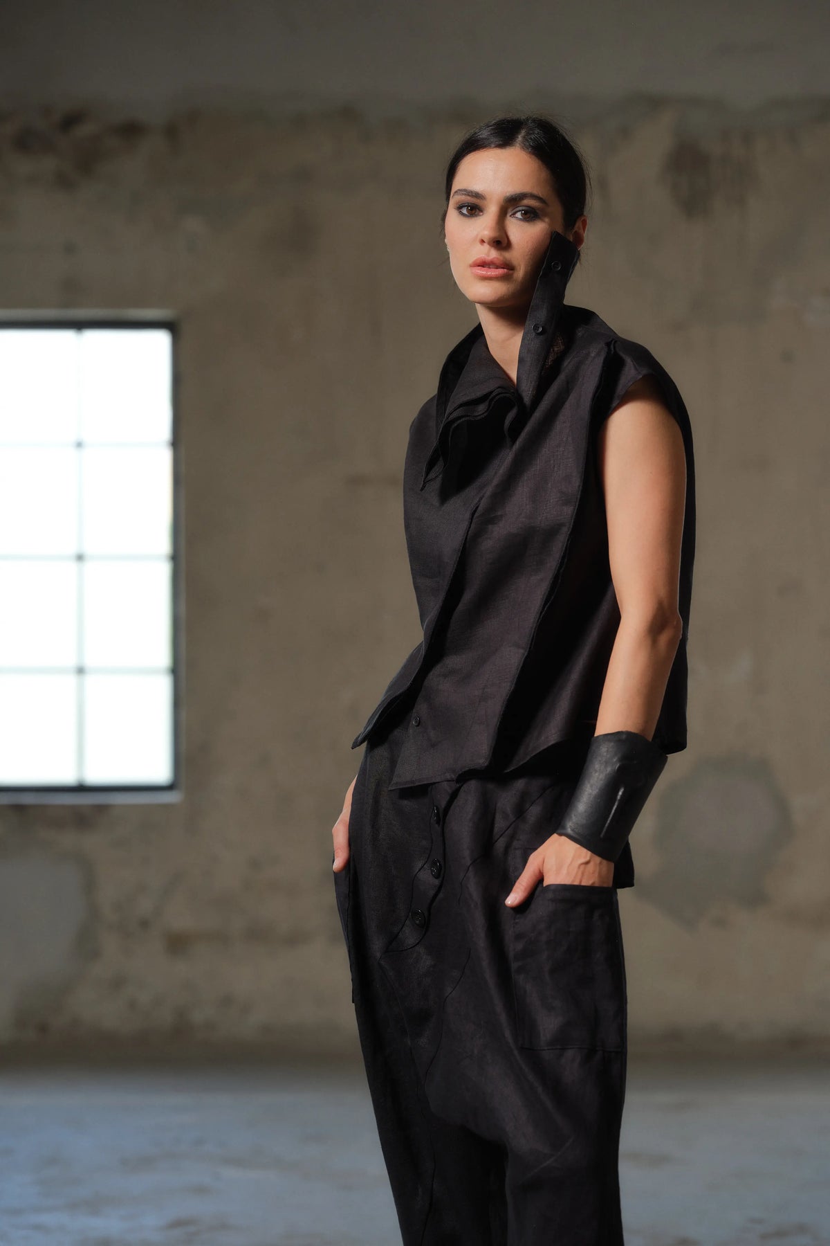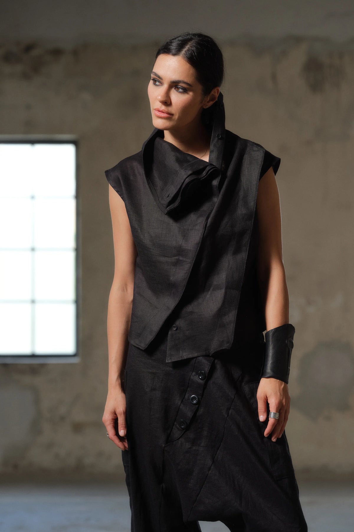 The top features an avant-garde high neck style, exuding a unique and fashion-forward aesthetic. Designed to be sleeveless and slouchy, this top offers a relaxed fit with a feminine line, allowing for comfortable and effortless wear. It is enhanced by an asymmetric semi-hidden front button fastening, adding an element of intrigue to the overall look.