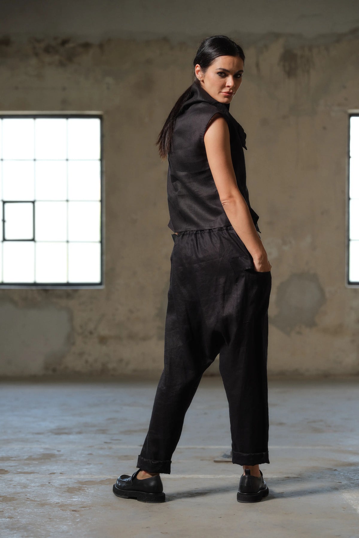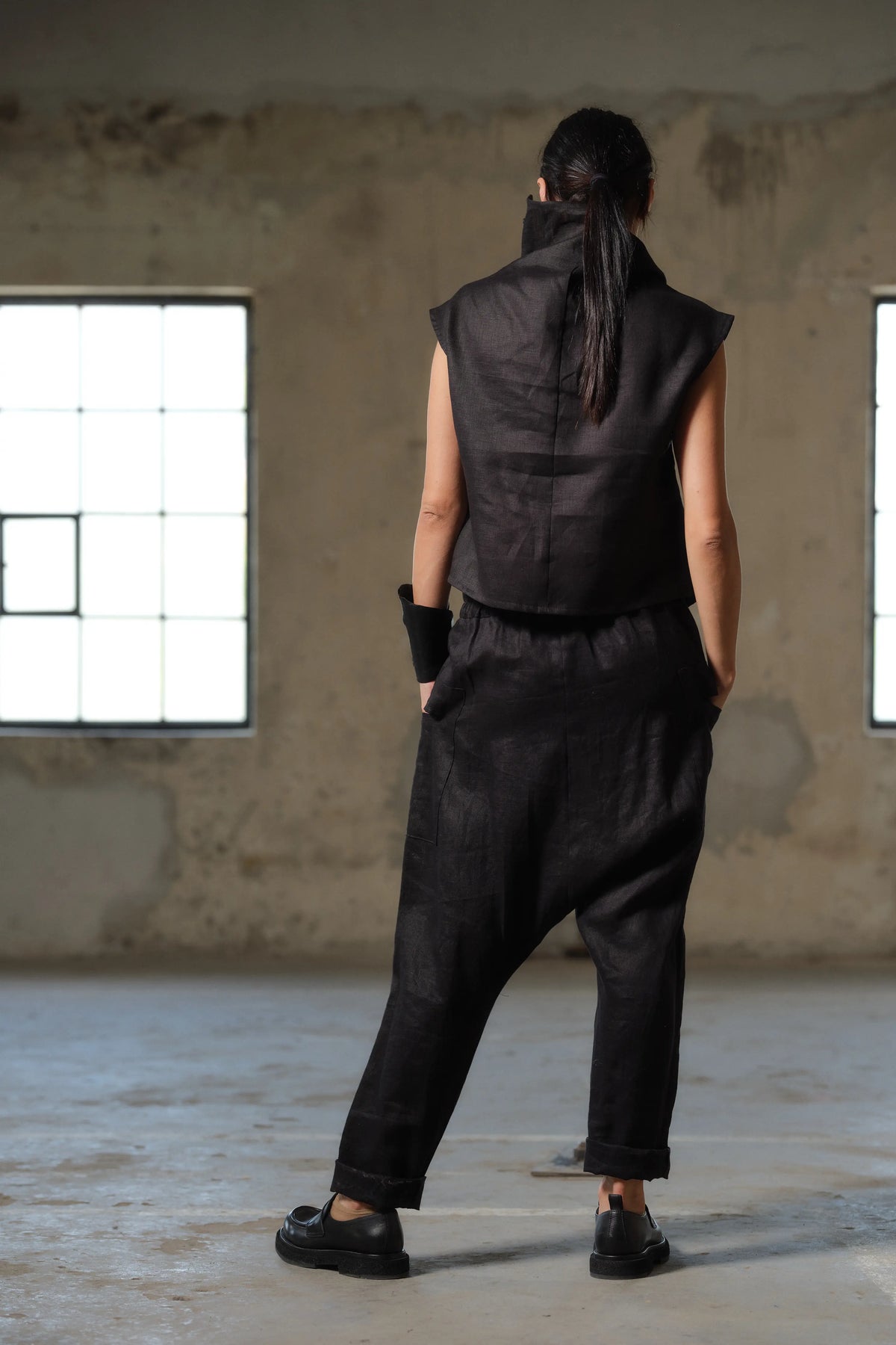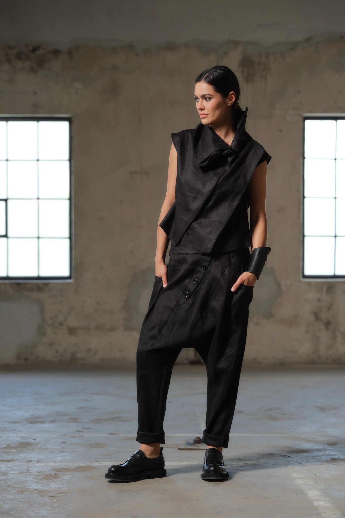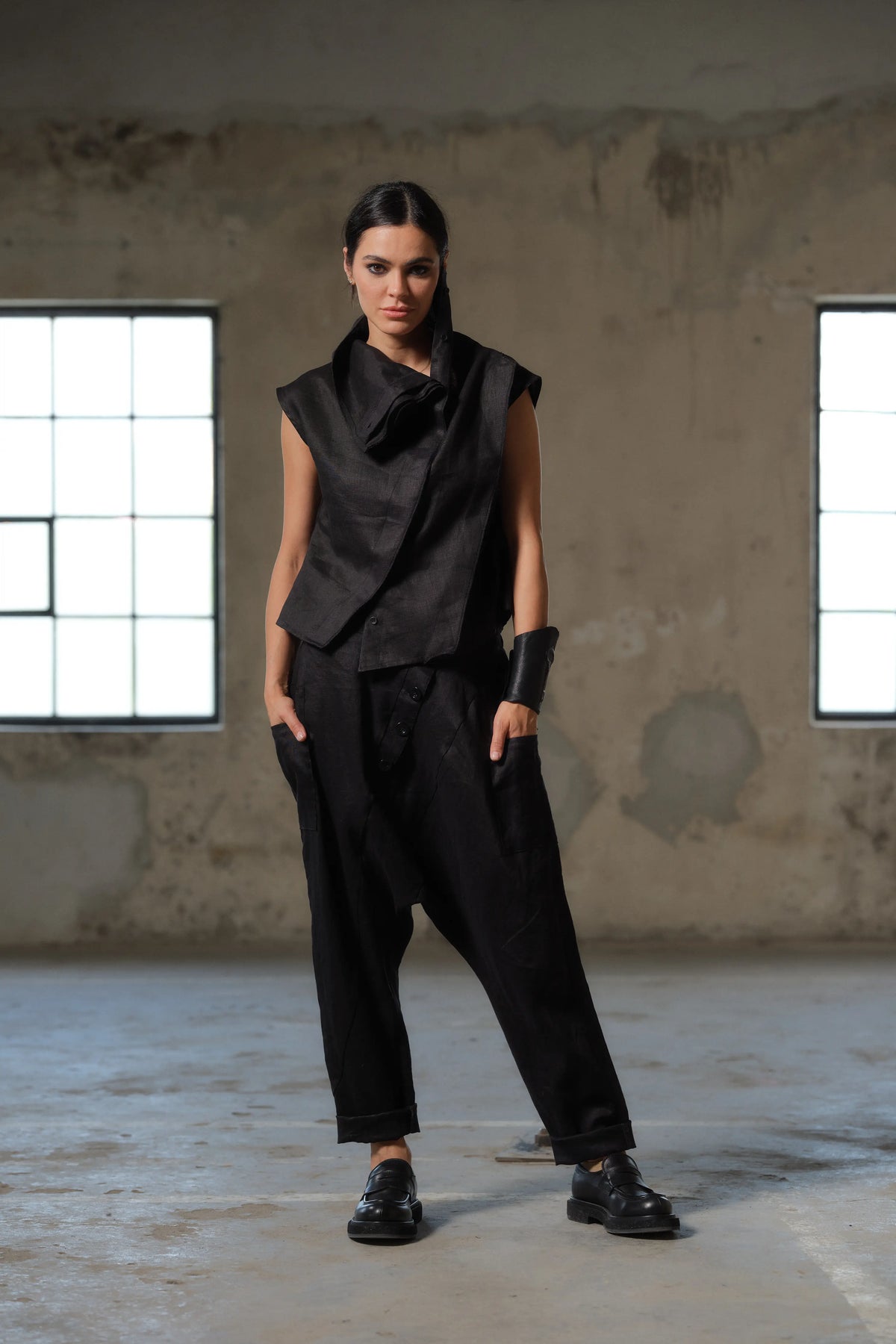 The top features an avant-garde high neck style, exuding a unique and fashion-forward aesthetic. Designed to be sleeveless and slouchy, this top offers a relaxed fit with a feminine line, allowing for comfortable and effortless wear. It is enhanced by an asymmetric semi-hidden front button fastening, adding an element of intrigue to the overall look.